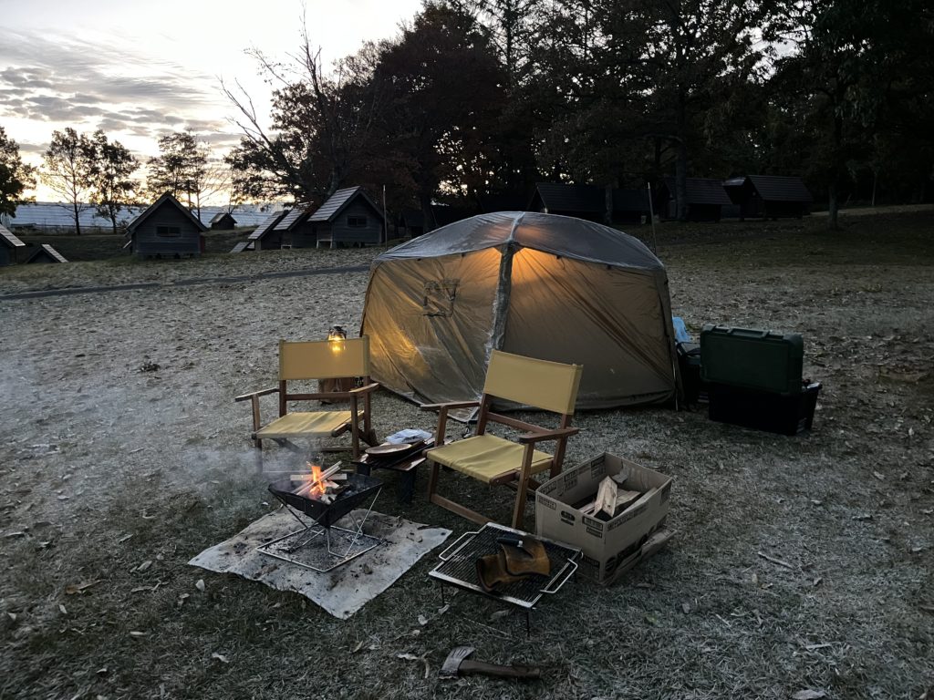 テント⛺️も凍りつき、霜が降りとる